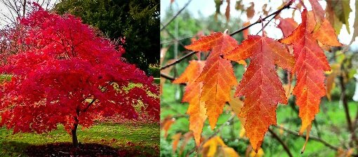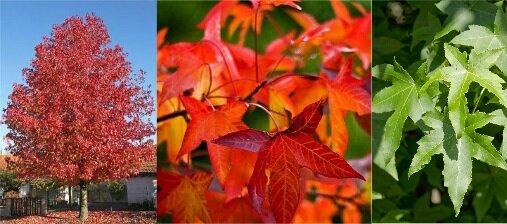 Liquidambar styraciflua Amerikai ámbrafa Magasság: 10-15 m magas kúp alakú fa Lomb: karélyos levelű, összel gyönyörű narancsos levelű fa Virágzás: gömbölyded,sárga virágú (V) Termés: gömbölyű tok termés