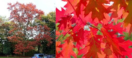 Vörös tölgy Magasság: 10-30 m magas sűrű, gömbölyded, tornyos koronájú fa Lomb: fényes mélyen karélyos nagy összel vörösödő levelek Virágzás: jelentéktelen Termés: -